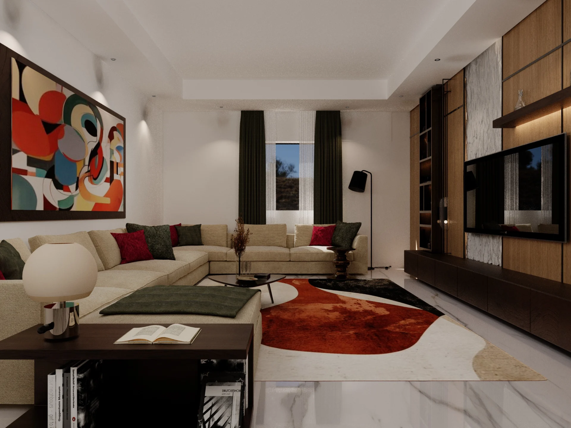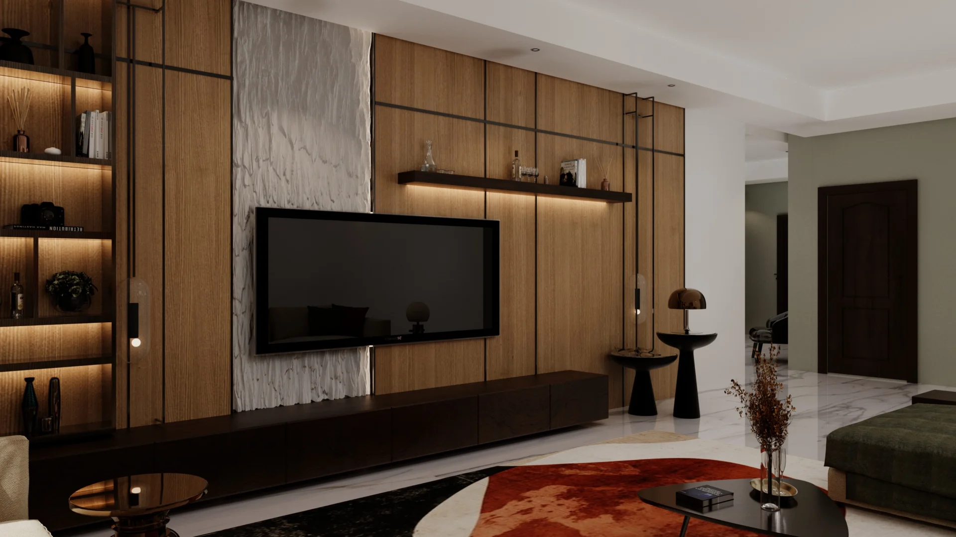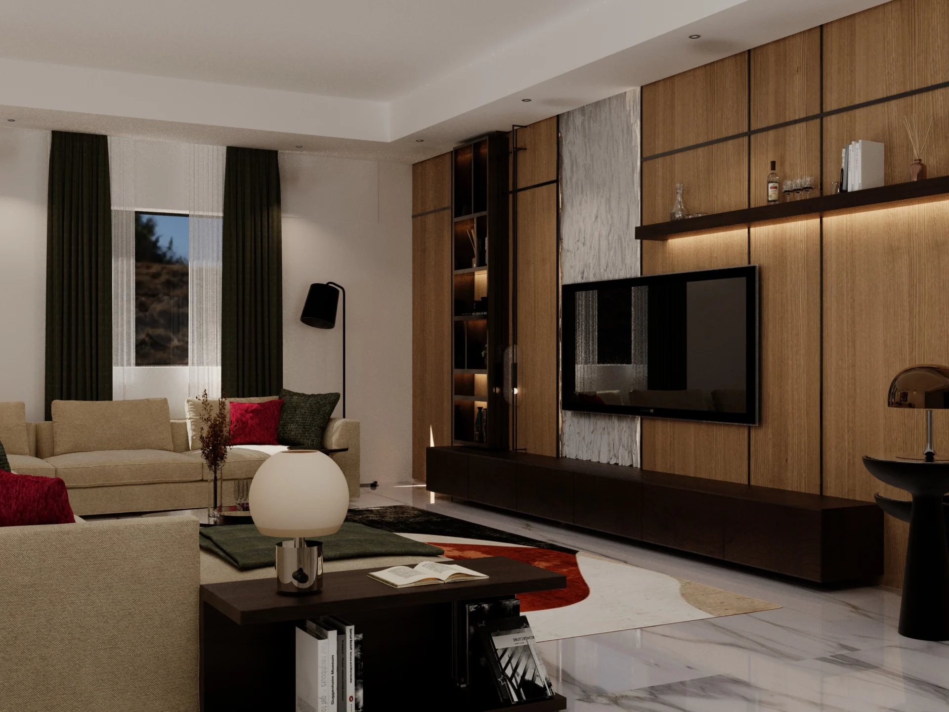تتميز غرفة المعيشة هذه بتصميم عصري دافئ بخطوط أنيقة ومواد طبيعية. يضم جدار خشبي ممتد على كامل ارتفاع الغرفة أرففًا مفتوحة ووحدات تخزين مخفية وجهاز تلفزيون معلق، مع لمسة جمالية من خلال لوحة رخامية عمودية تضفي تباينًا رقيقًا. كما تُبرز الإضاءة المدمجة الناعمة ملمس الخشب وتضيف عمقًا للغرفة.