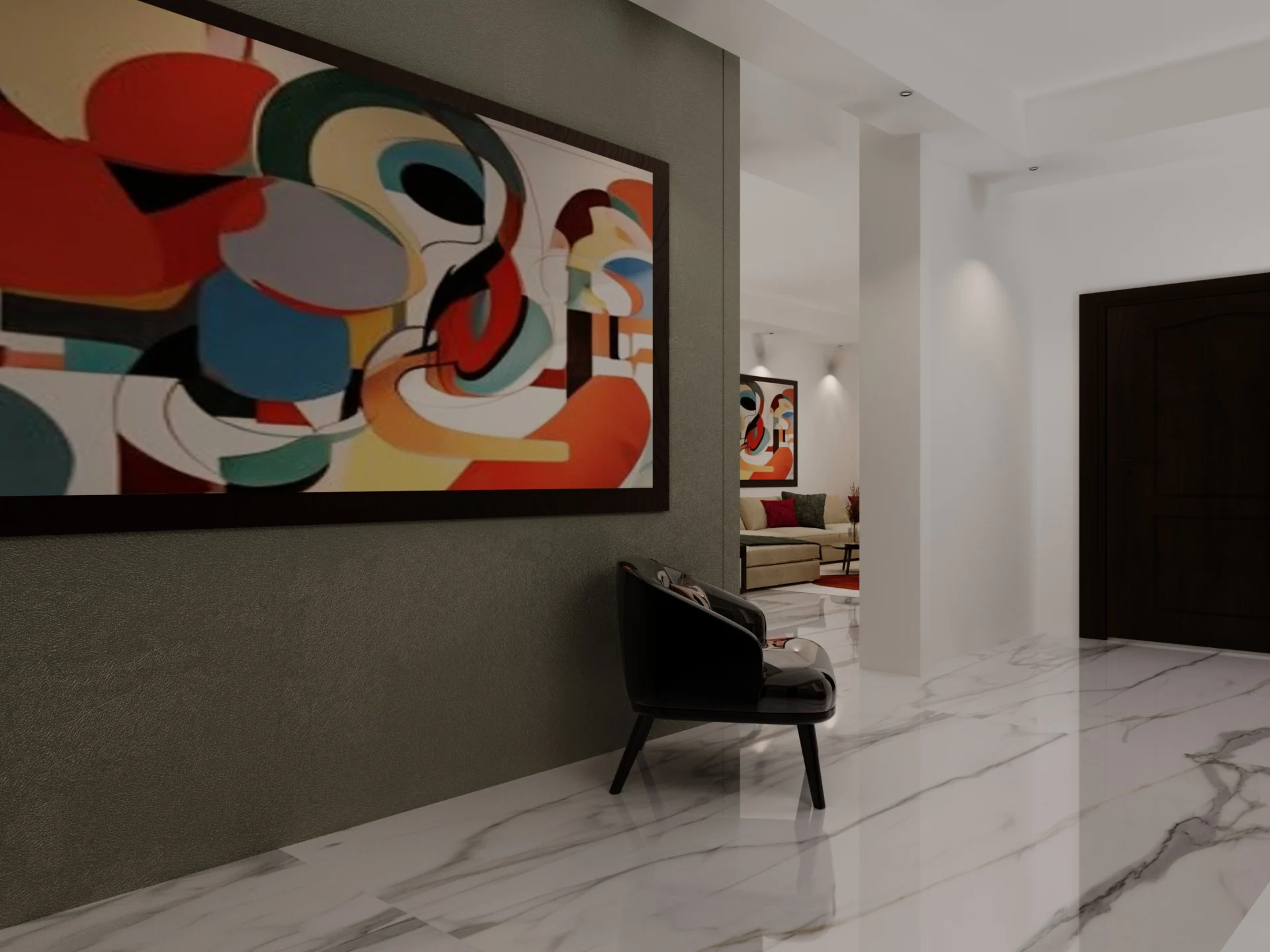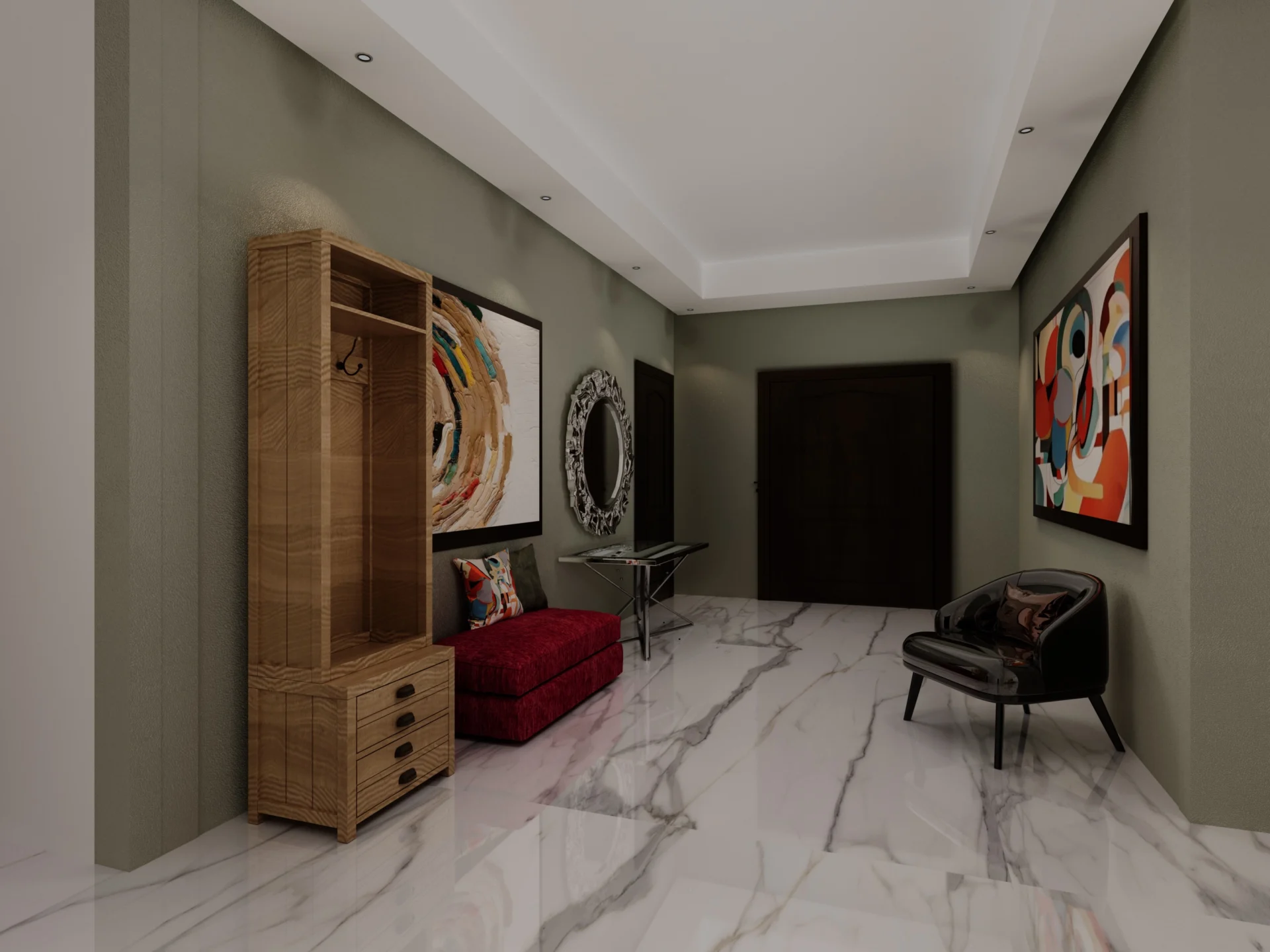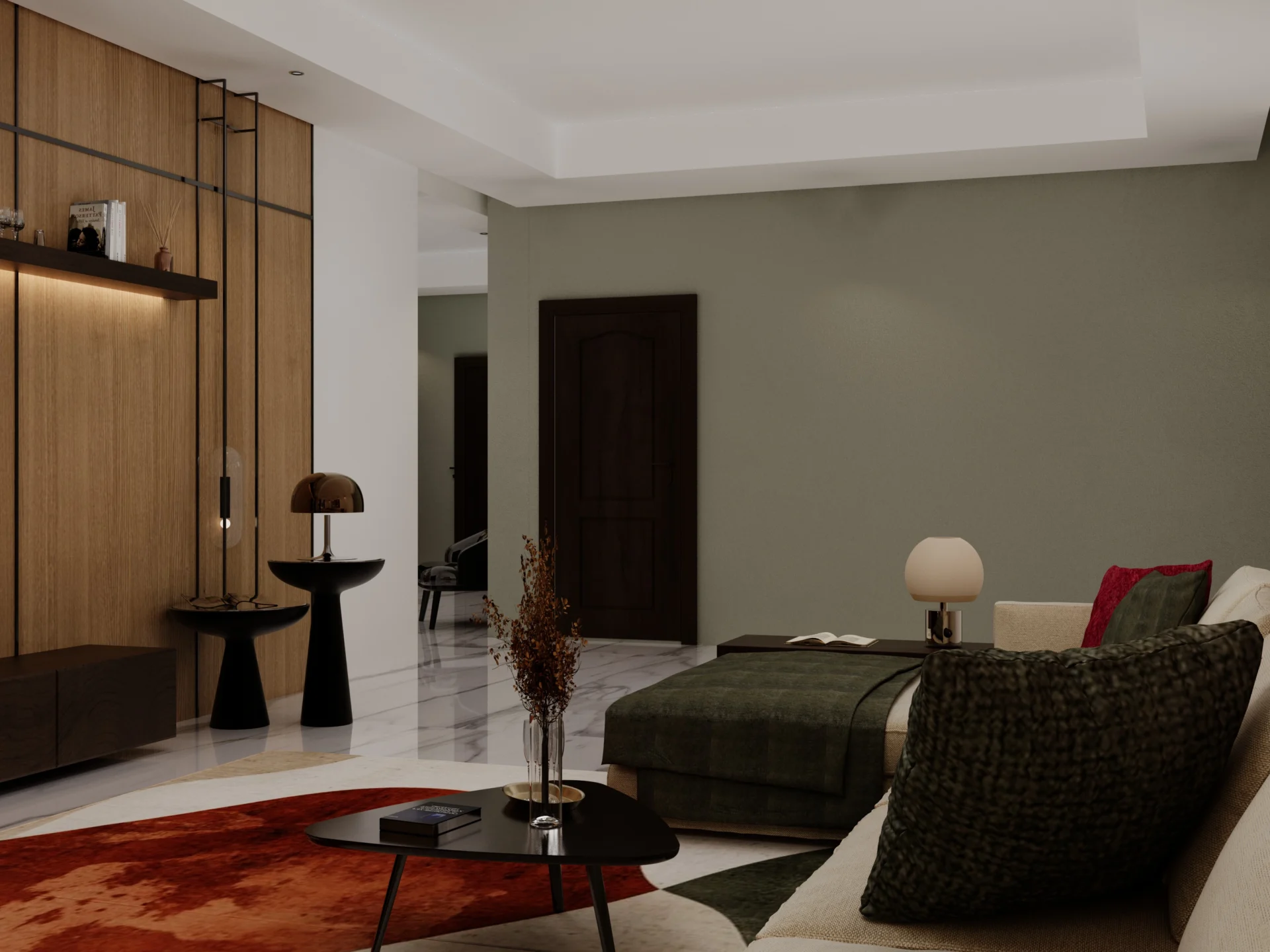 تتميز غرفة المعيشة هذه بتصميم عصري دافئ بخطوط أنيقة ومواد طبيعية. يضم جدار خشبي ممتد على كامل ارتفاع الغرفة أرففًا مفتوحة ووحدات تخزين مخفية وجهاز تلفزيون معلق، مع لمسة جمالية من خلال لوحة رخامية عمودية تضفي تباينًا رقيقًا. كما تُبرز الإضاءة المدمجة الناعمة ملمس الخشب وتضيف عمقًا للغرفة.
