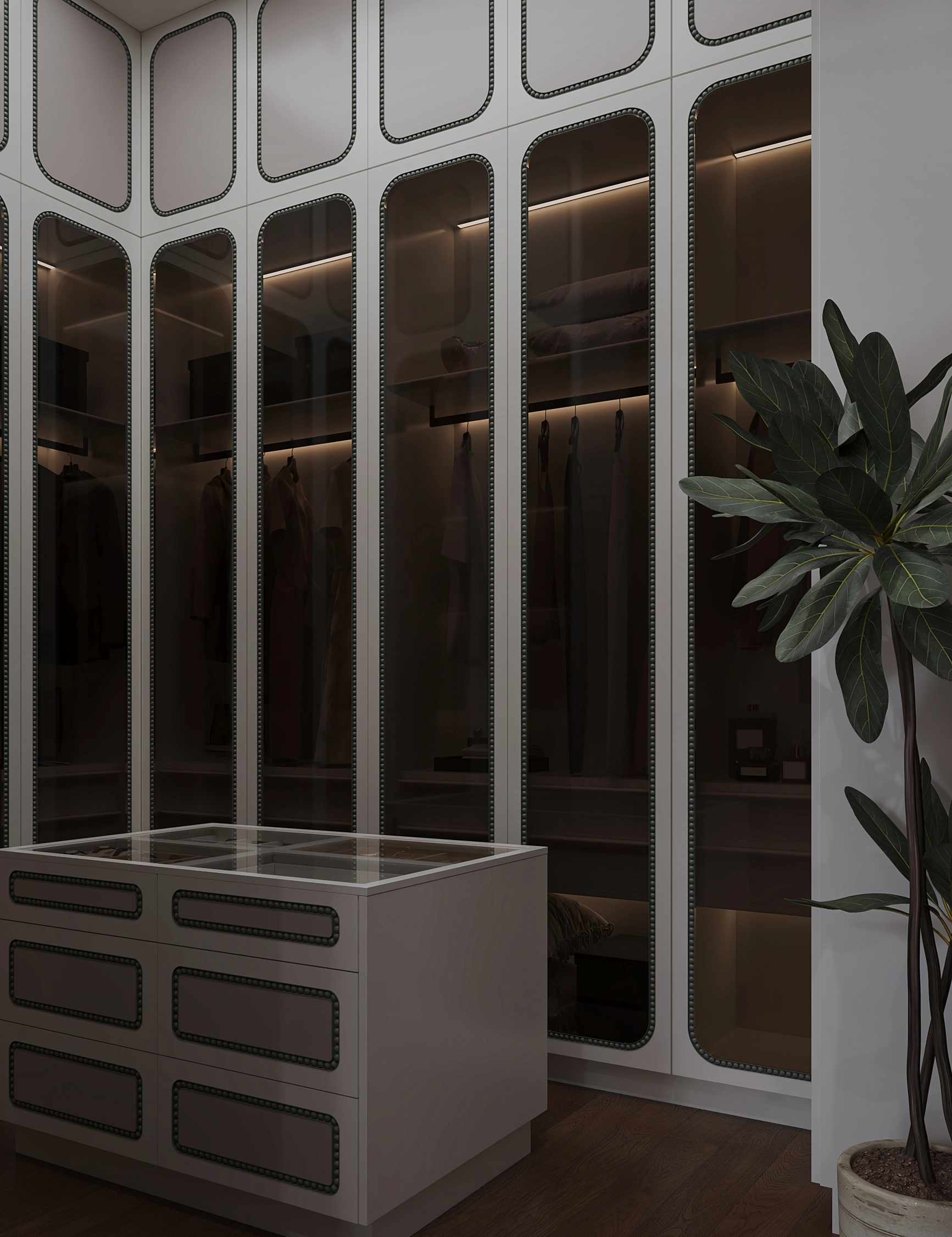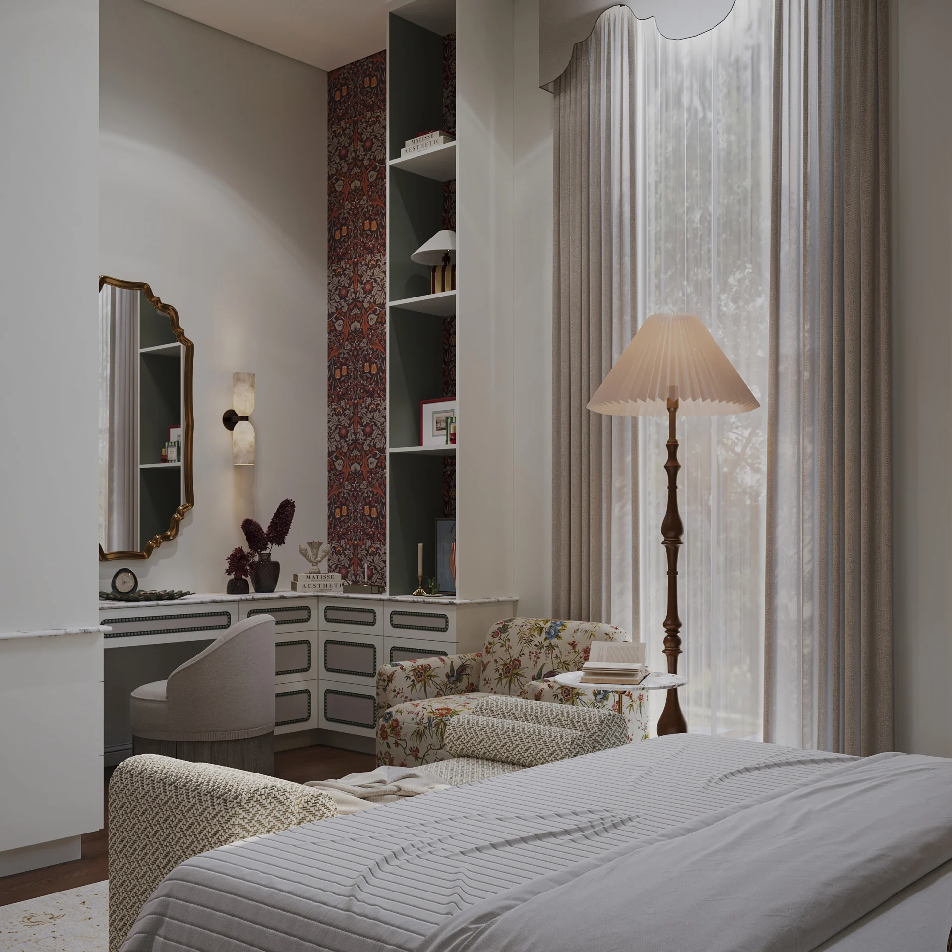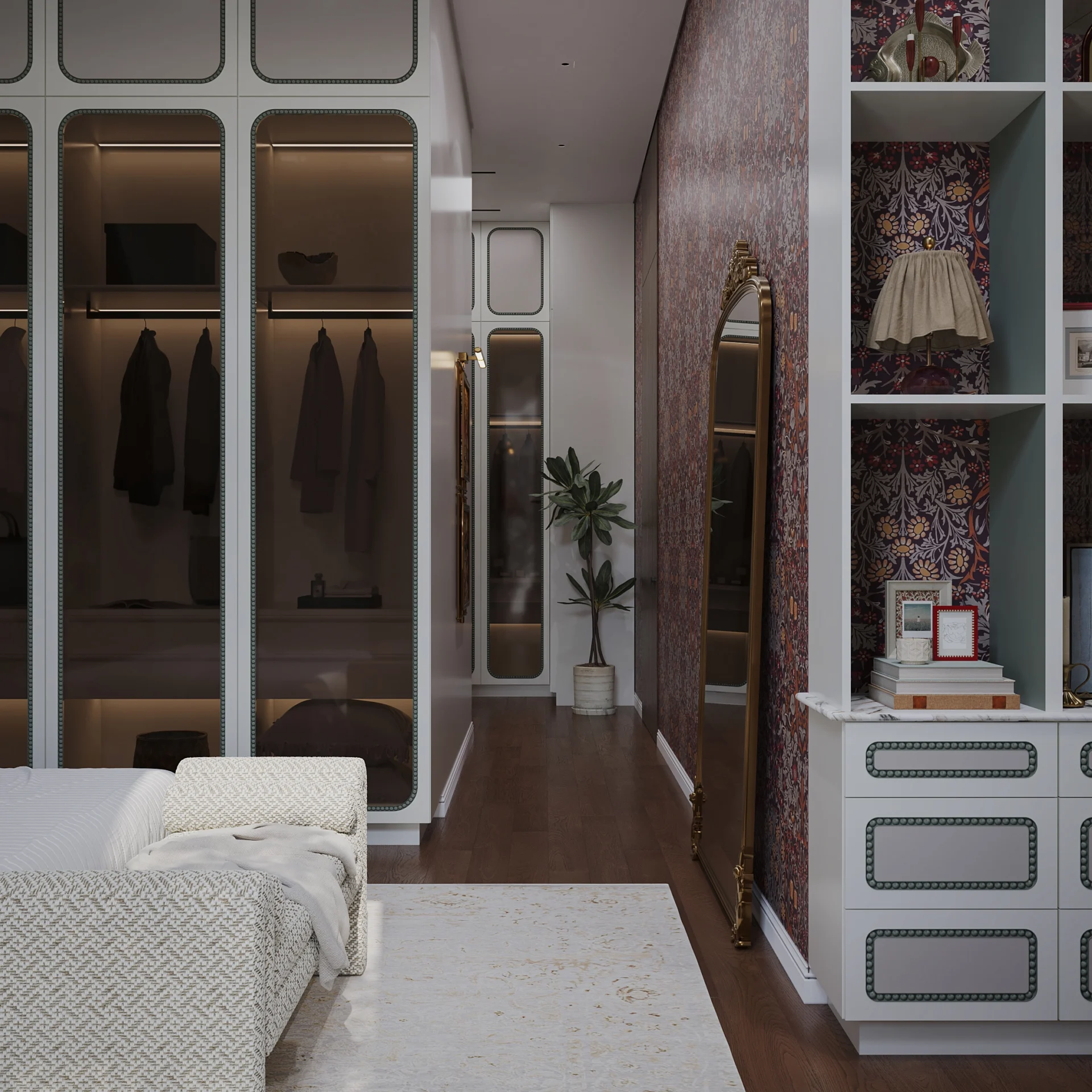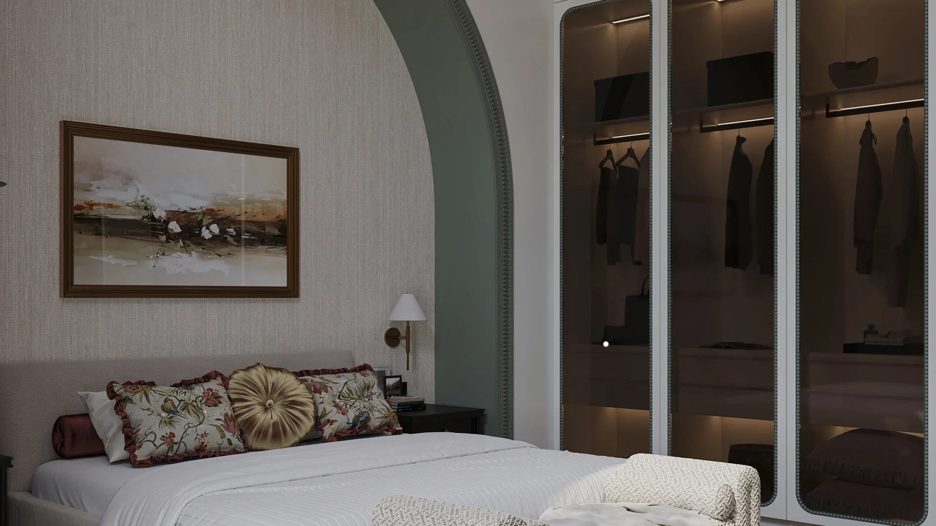 غرفة نوم عصرية كلاسيكية تتميز بقوس أخضر فاتح بارز يحيط بالسرير، مما يضفي عمقًا معماريًا وأناقة. تخلق الألوان المحايدة من العاجي والبيج ودرجات الخشب الدافئة جوًا هادئًا وراقيًا. خزائن ملابس مصممة خصيصًا بارتفاع كامل مع زجاج ملون وإضاءة مدمجة تعزز الشعور بالفخامة. إضاءة متعددة الطبقات، وتشطيبات مميزة، وأثاث منجد ناعم يكمل هذا الفضاء الهادئ المستوحى من فنادق البوتيك.