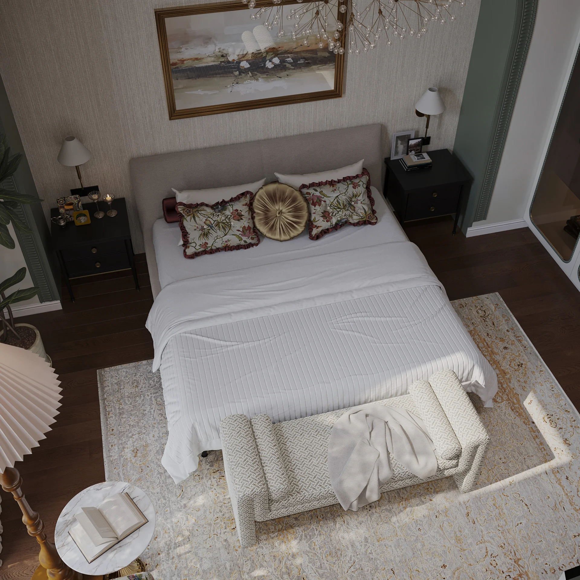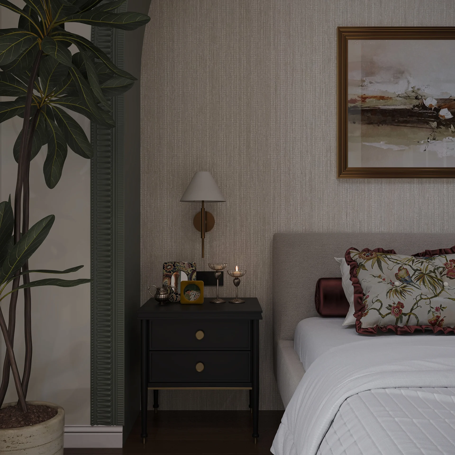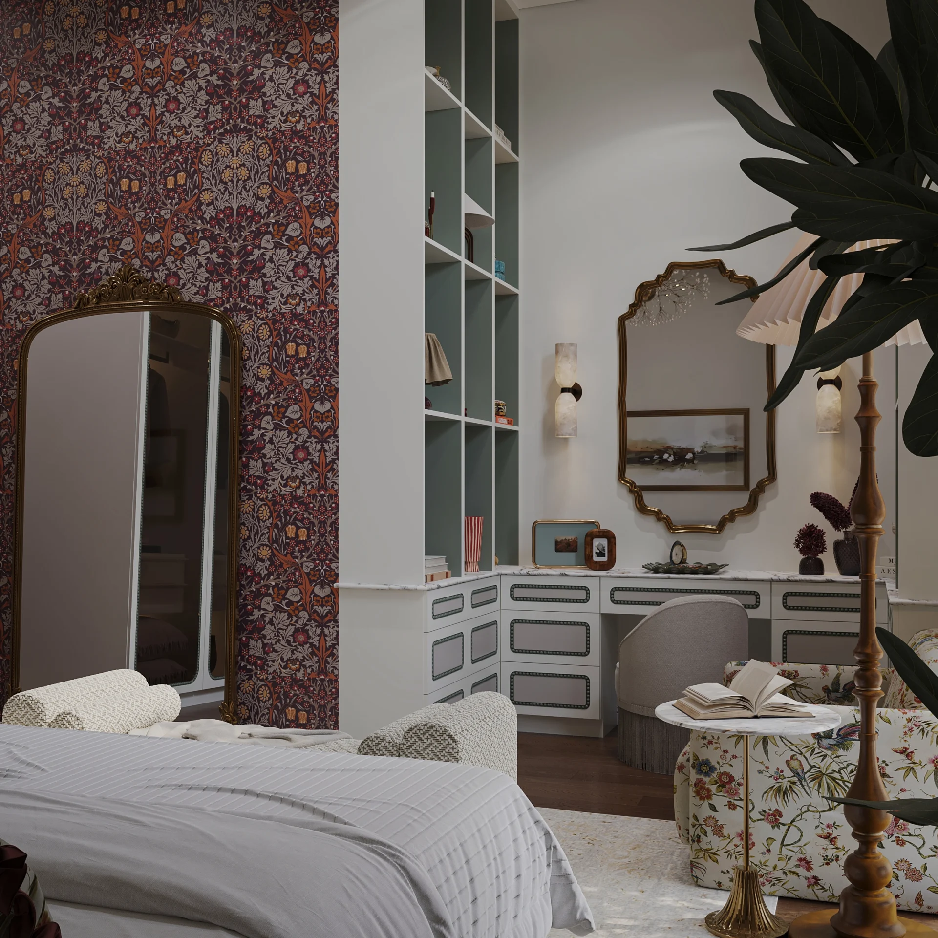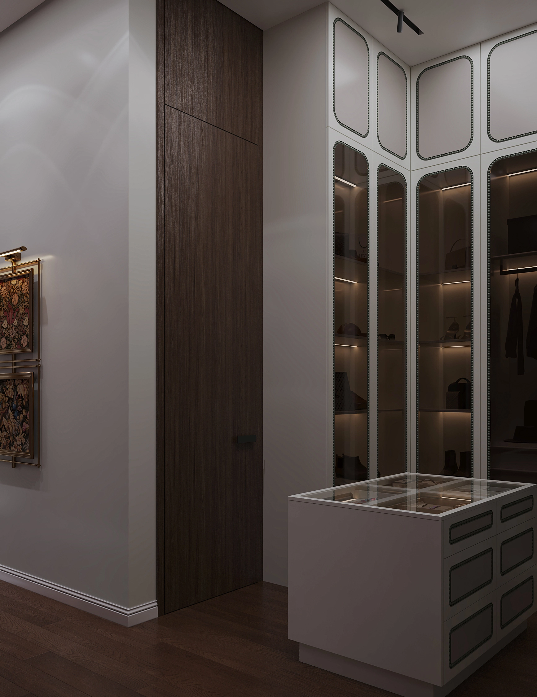 غرفة نوم عصرية كلاسيكية تتميز بقوس أخضر فاتح بارز يحيط بالسرير، مما يضفي عمقًا معماريًا وأناقة. تخلق الألوان المحايدة من العاجي والبيج ودرجات الخشب الدافئة جوًا هادئًا وراقيًا. خزائن ملابس مصممة خصيصًا بارتفاع كامل مع زجاج ملون وإضاءة مدمجة تعزز الشعور بالفخامة. إضاءة متعددة الطبقات، وتشطيبات مميزة، وأثاث منجد ناعم يكمل هذا الفضاء الهادئ المستوحى من فنادق البوتيك.